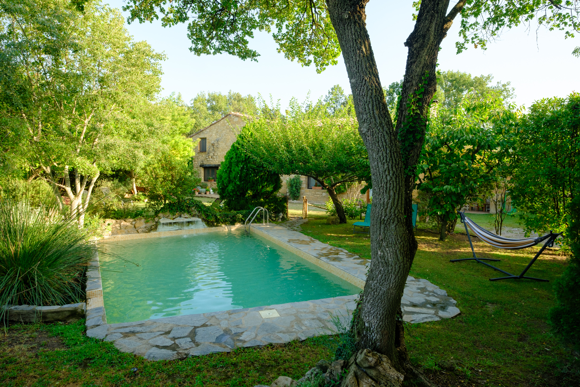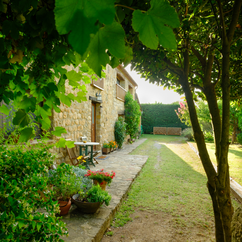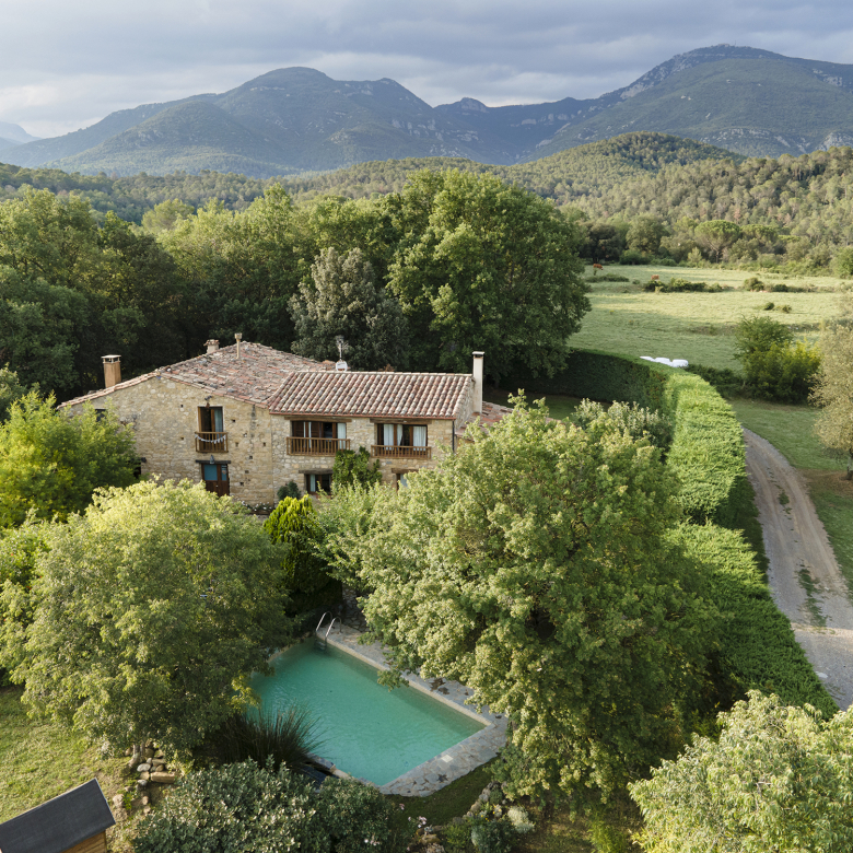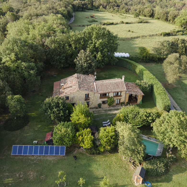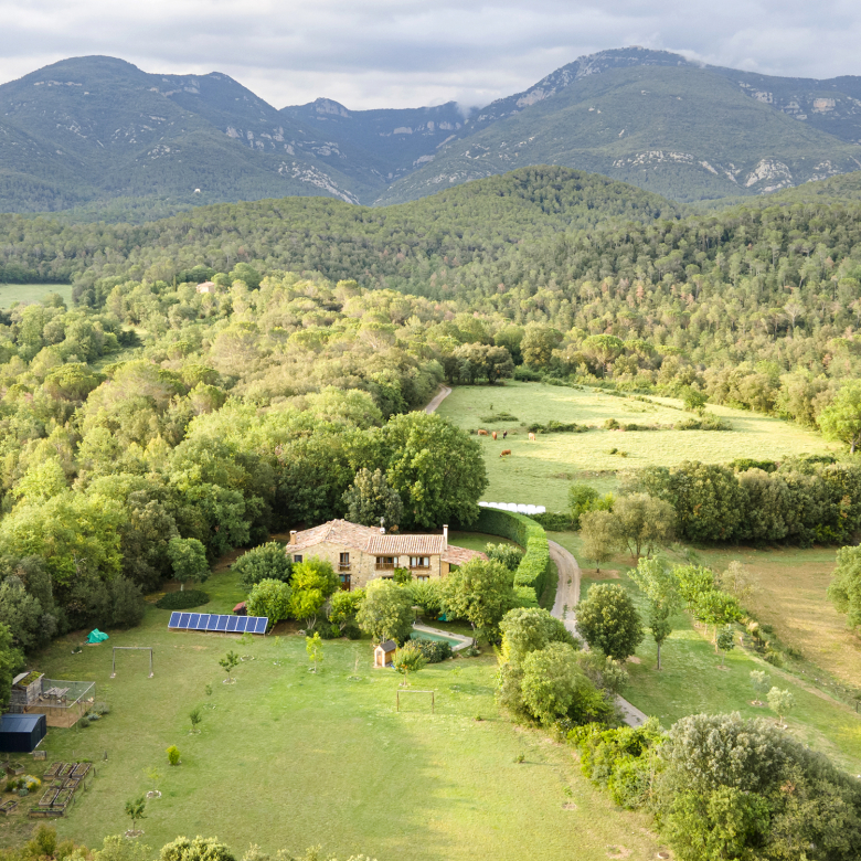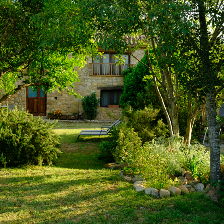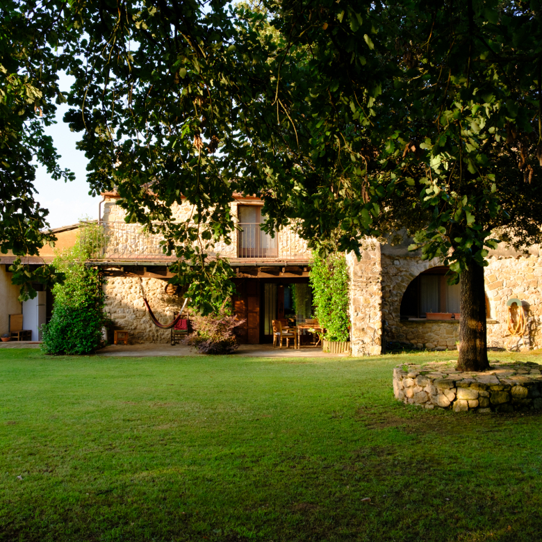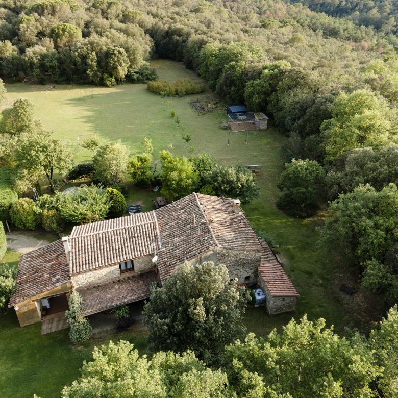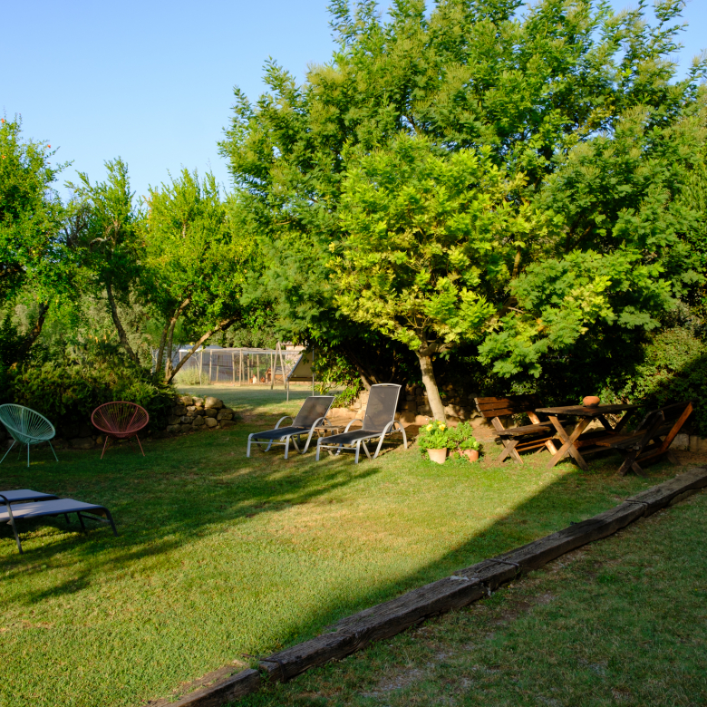 A part dels camps i el bosc, al voltant de l’habitatge disposa de piscina natural amb enjardinament ben aconseguit integrant una zona d’hort i galliner i un laberint amb especies vegetals que et porta al bosc on hi ha hamaques de corda, gronxadors i una taula de troncs que complementen i conecten els espais.