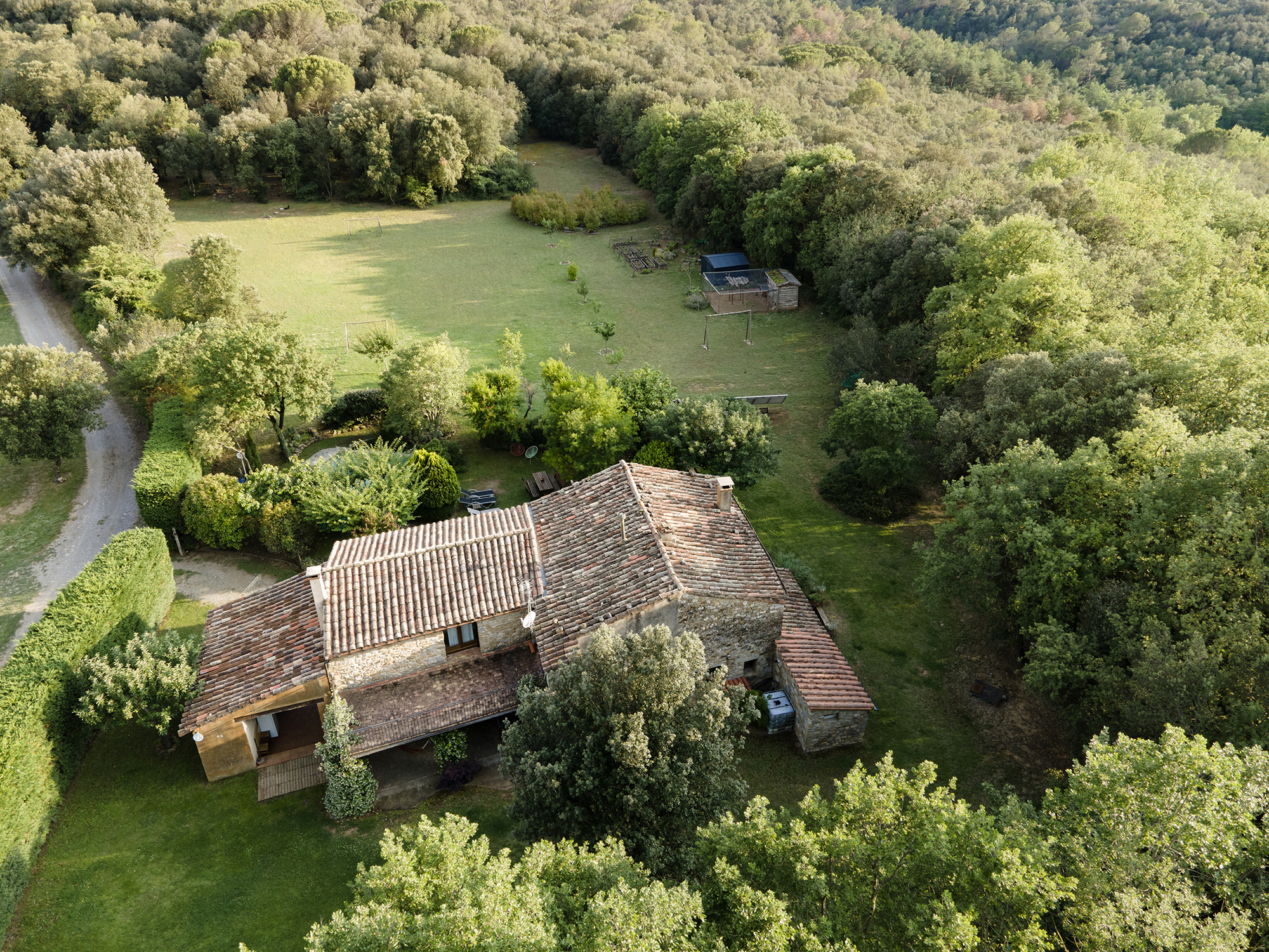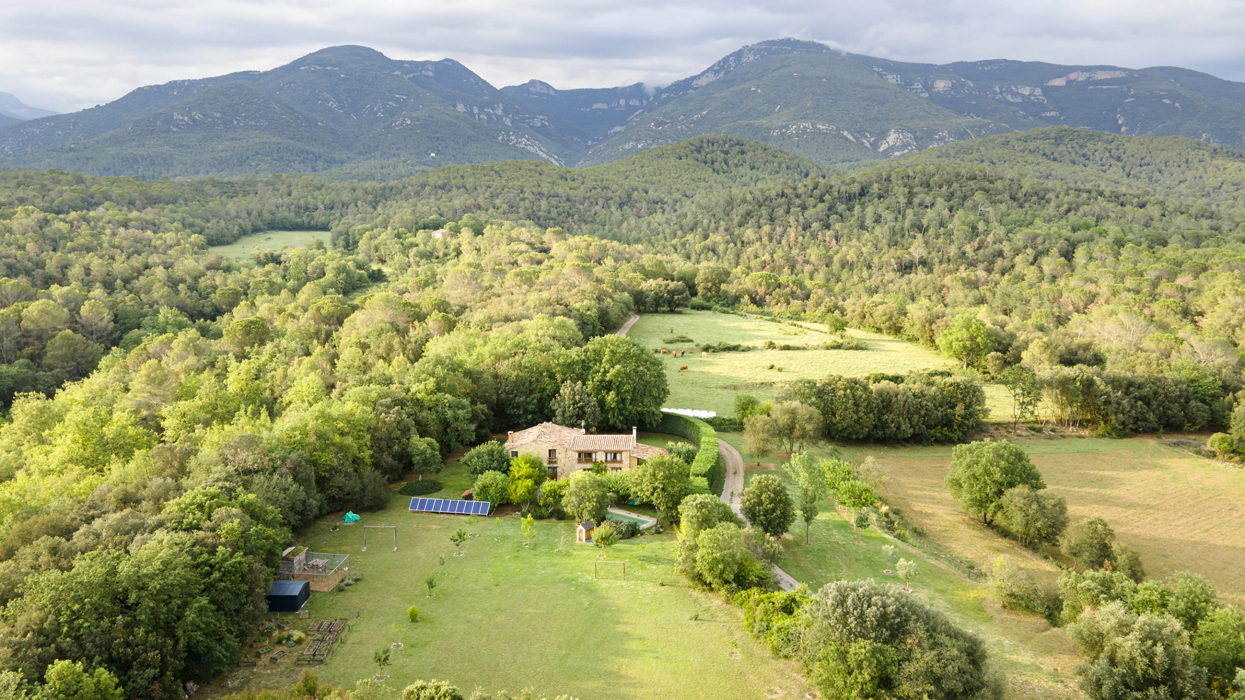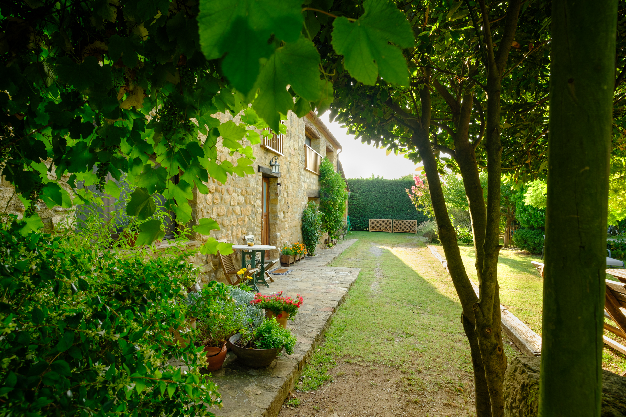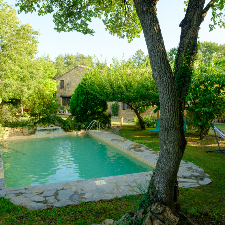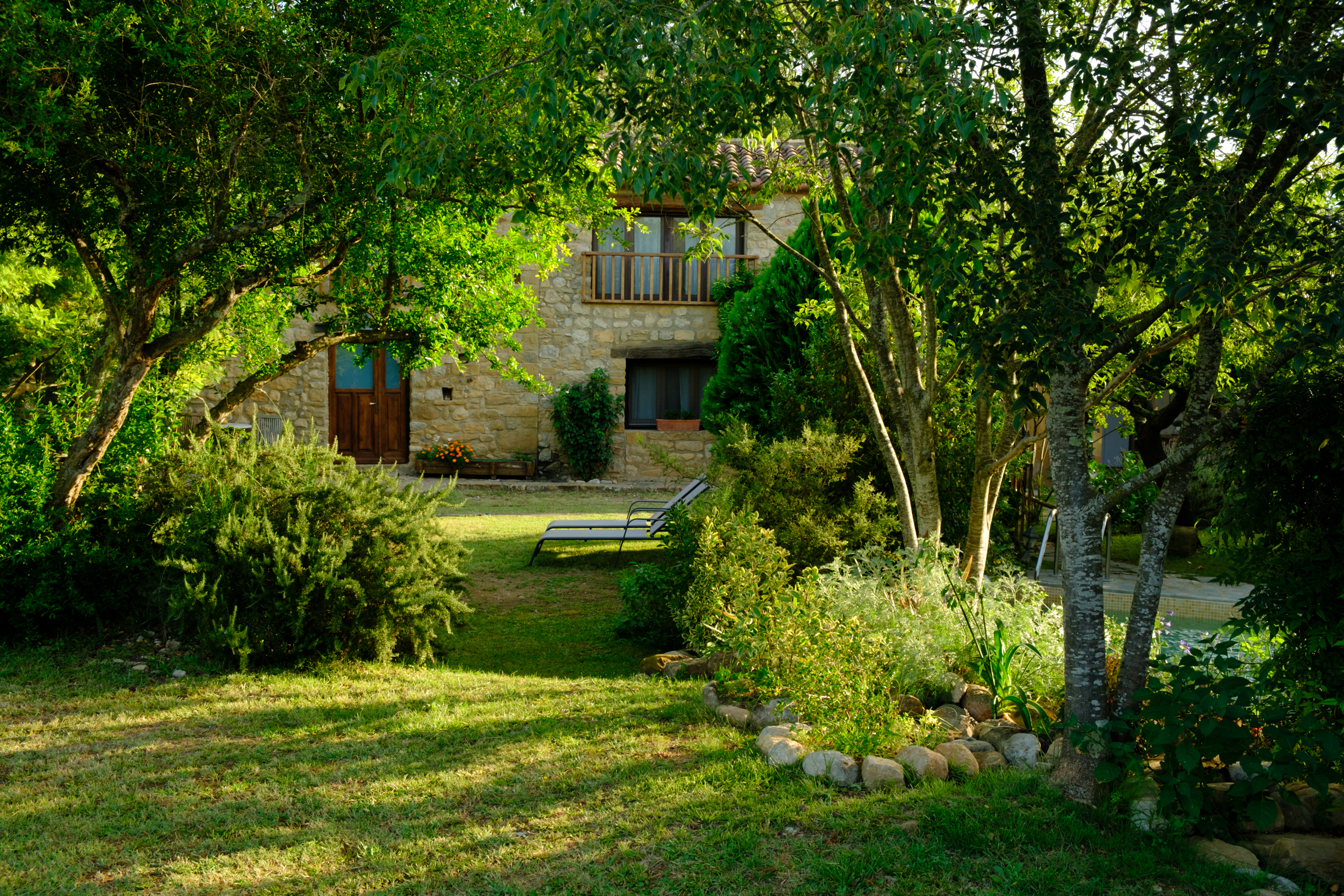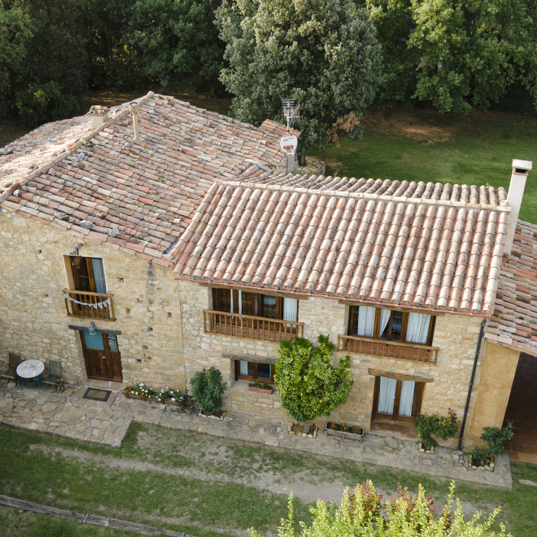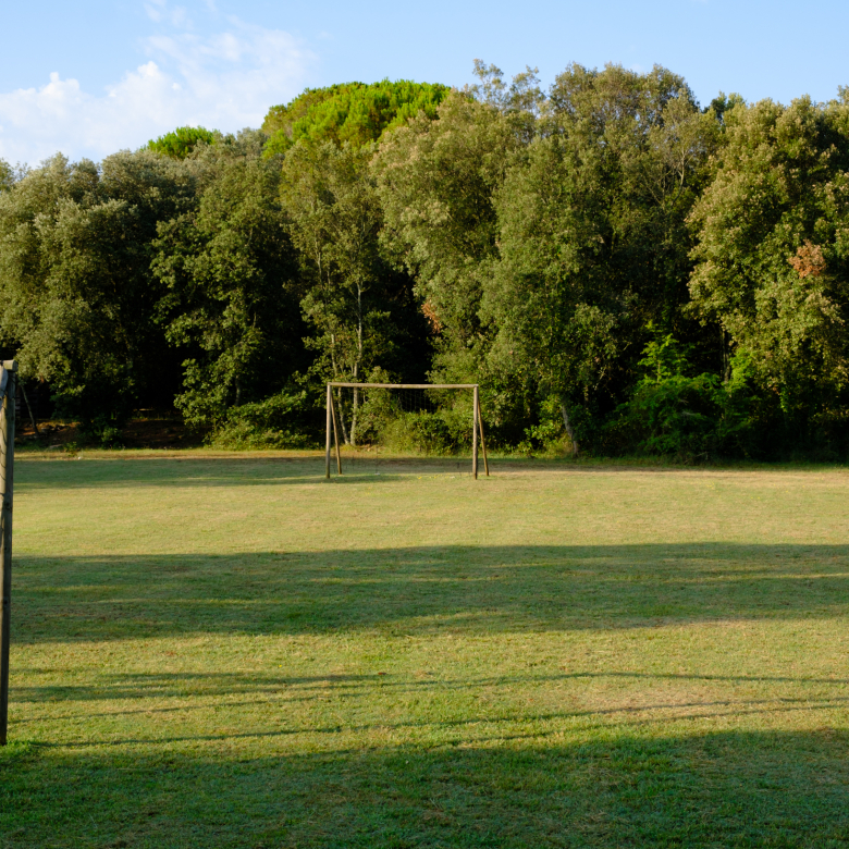 A part dels camps i el bosc, al voltant de l’habitatge disposa de piscina natural amb enjardinament ben aconseguit integrant una zona d’hort i galliner i un laberint amb especies vegetals que et porta al bosc on hi ha hamaques de corda, gronxadors i una taula de troncs que complementen i conecten els espais.