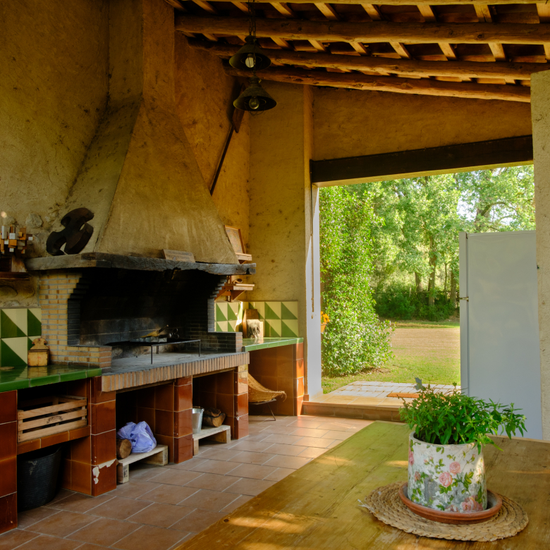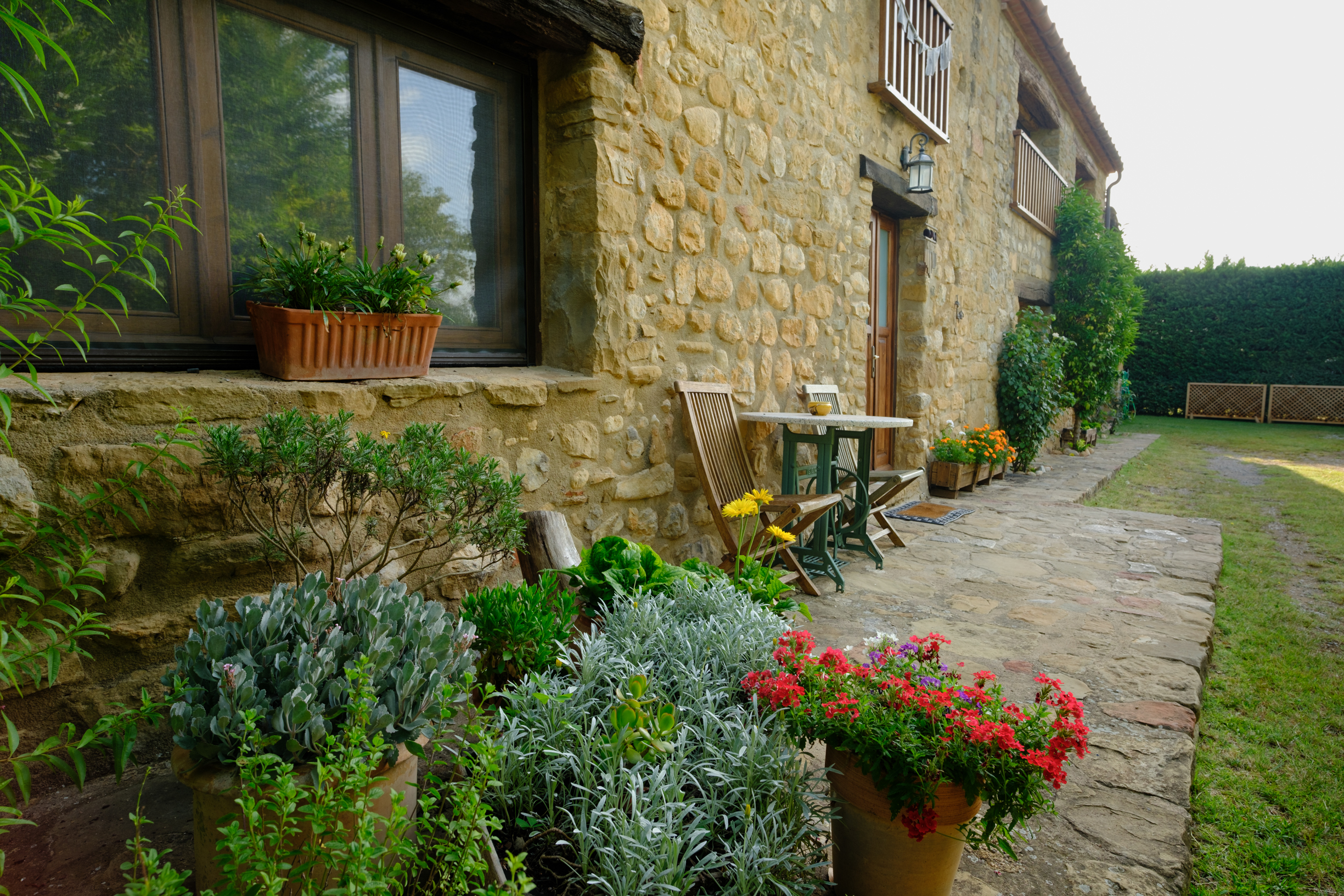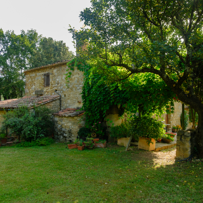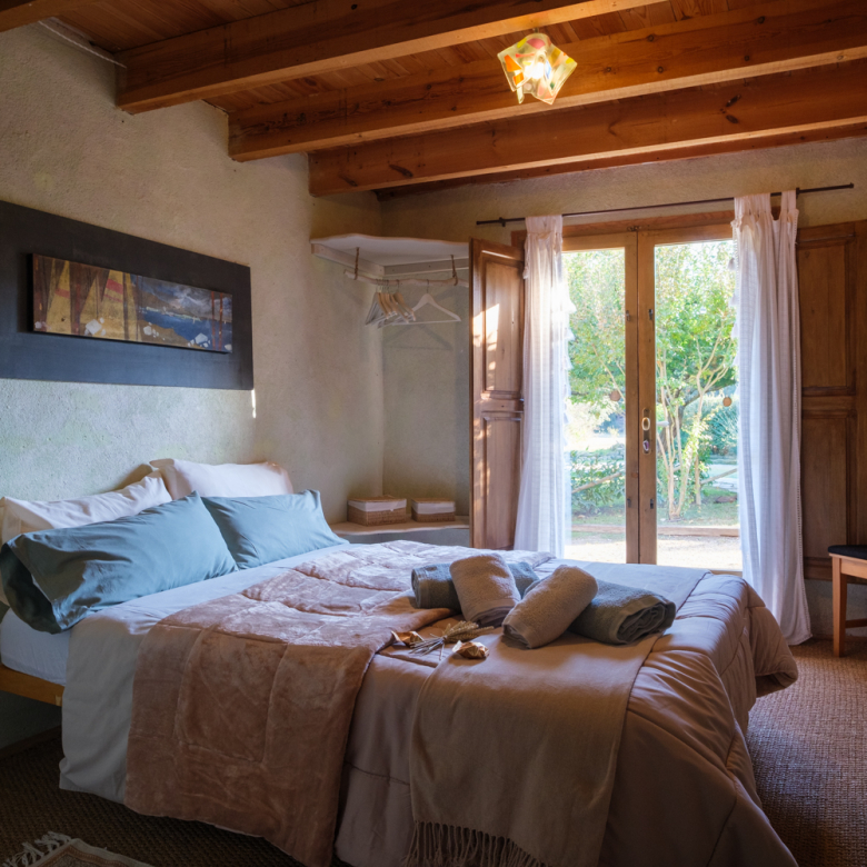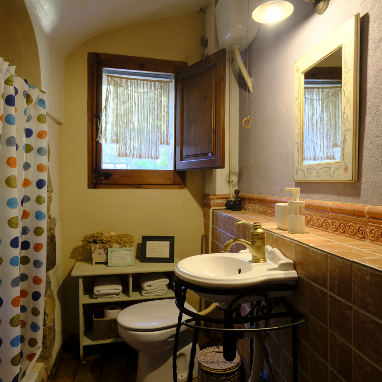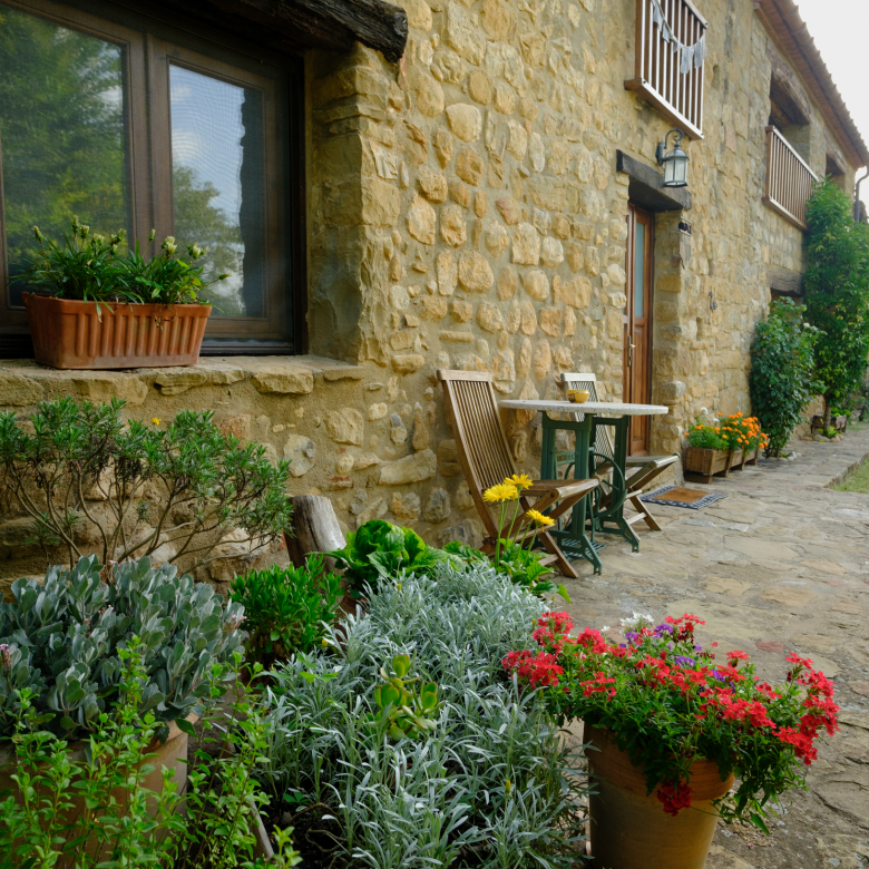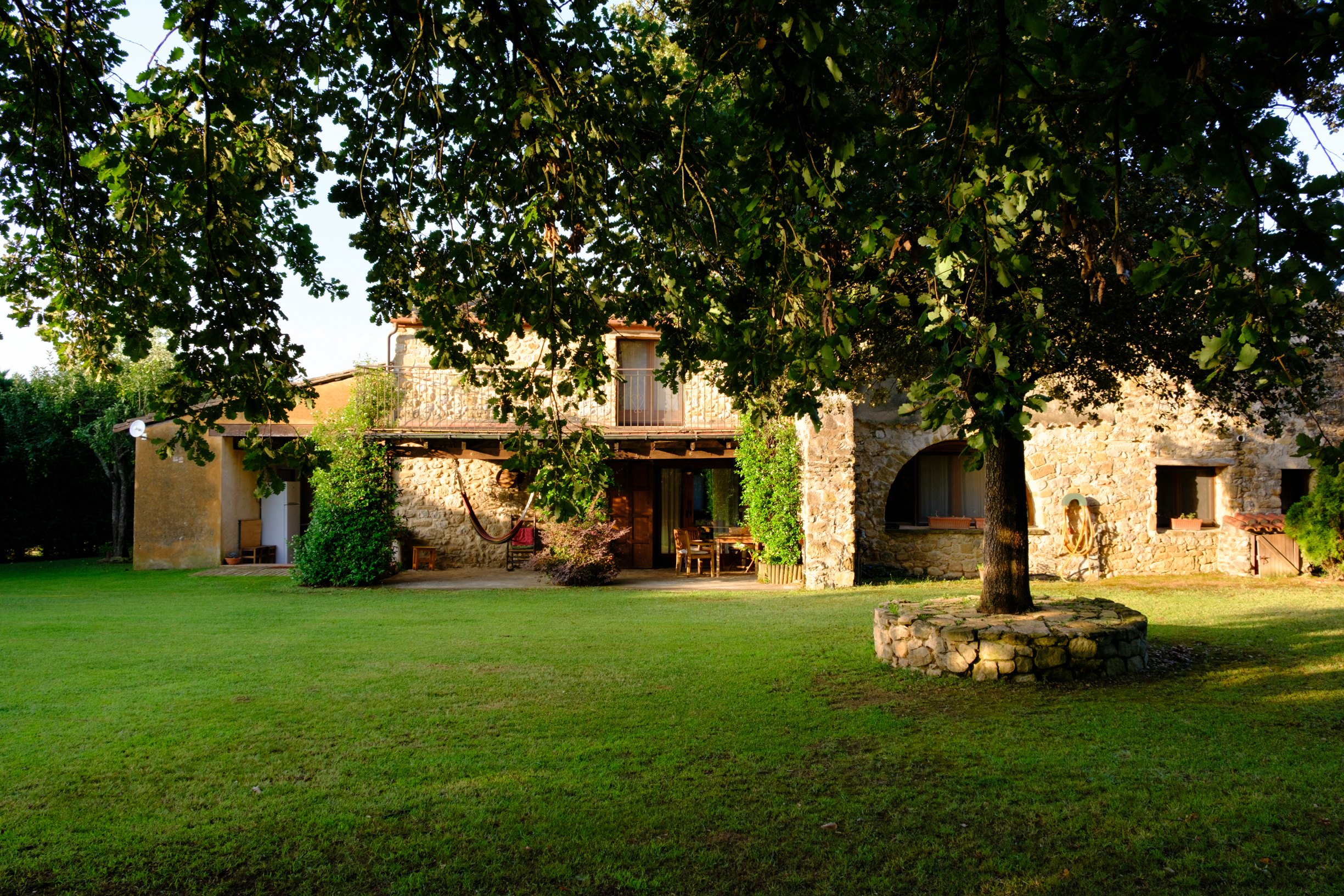 A part dels camps i el bosc, al voltant de l’habitatge disposa de piscina natural amb enjardinament ben aconseguit integrant una zona d’hort i galliner i un laberint amb especies vegetals que et porta al bosc on hi ha hamaques de corda, gronxadors i una taula de troncs que complementen i conecten els espais.