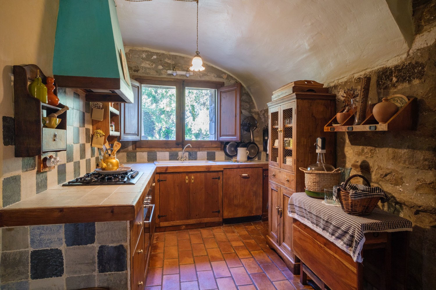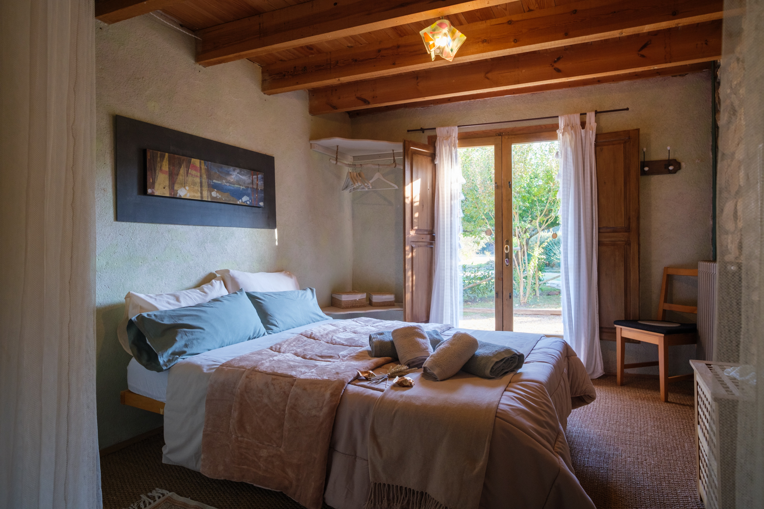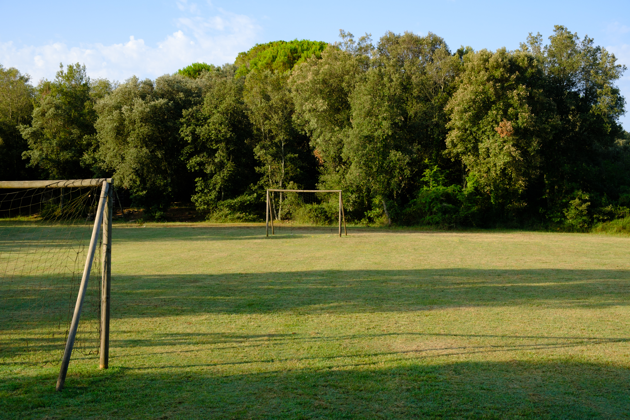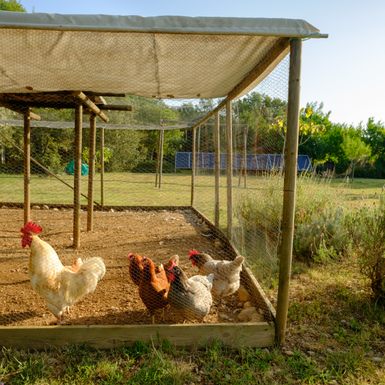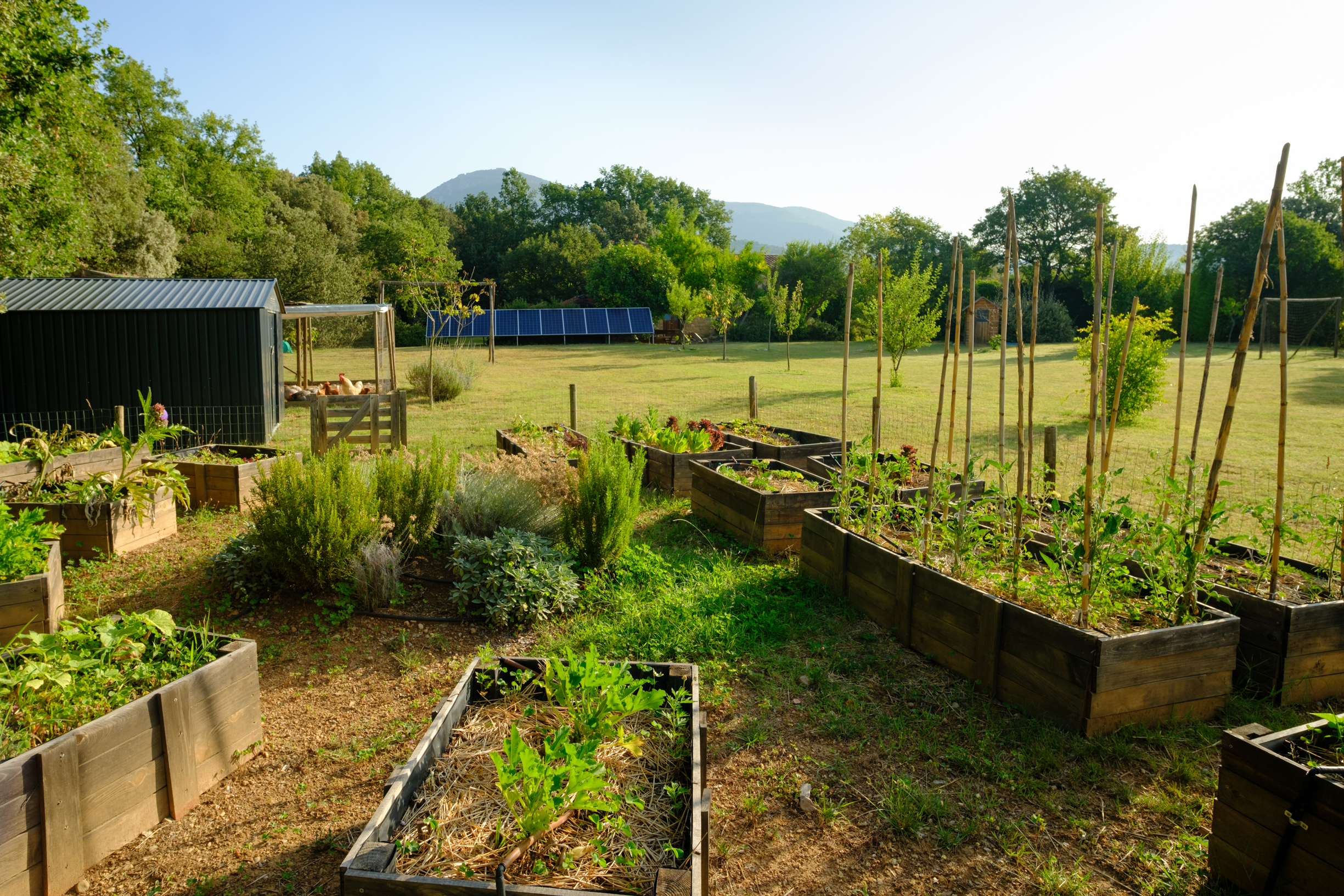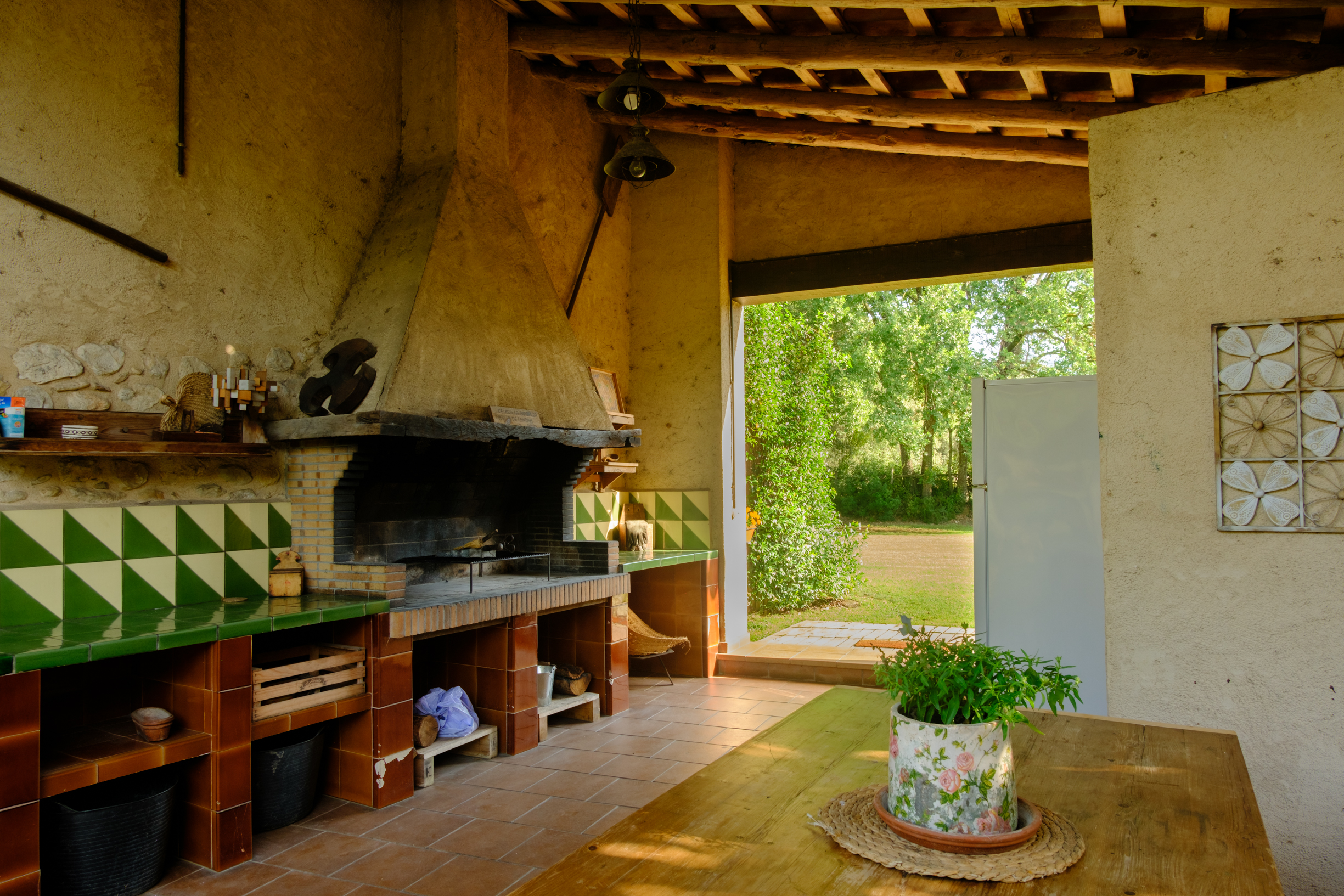 A part dels camps i el bosc, al voltant de l’habitatge disposa de piscina natural amb enjardinament ben aconseguit integrant una zona d’hort i galliner i un laberint amb especies vegetals que et porta al bosc on hi ha hamaques de corda, gronxadors i una taula de troncs que complementen i conecten els espais.