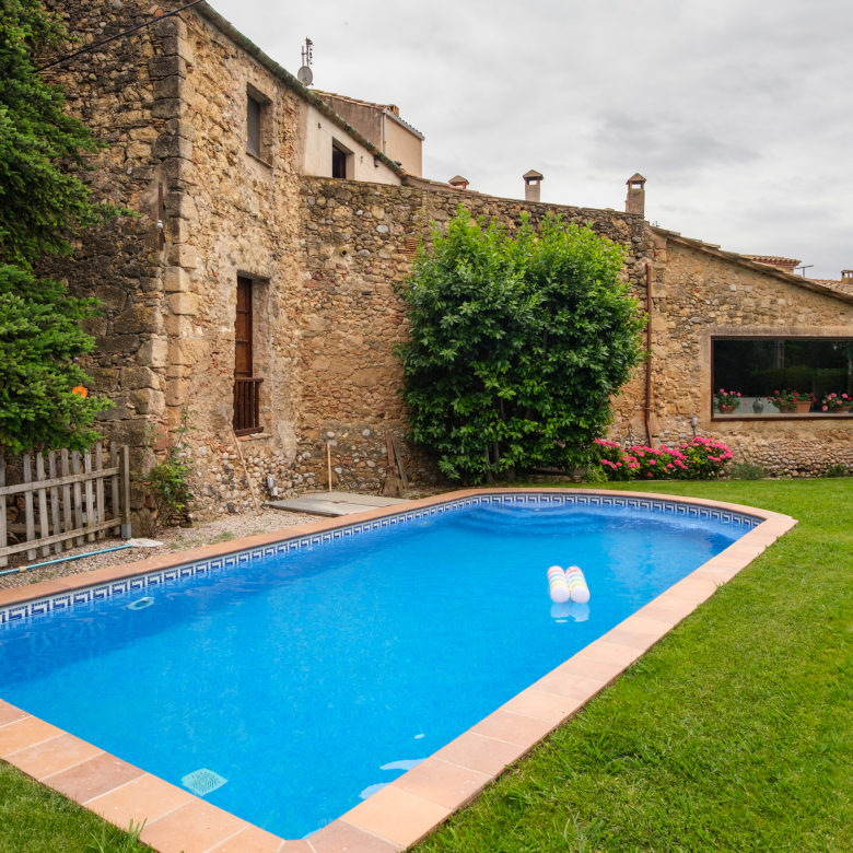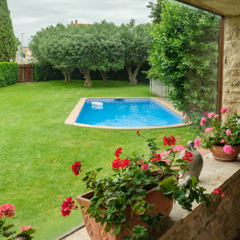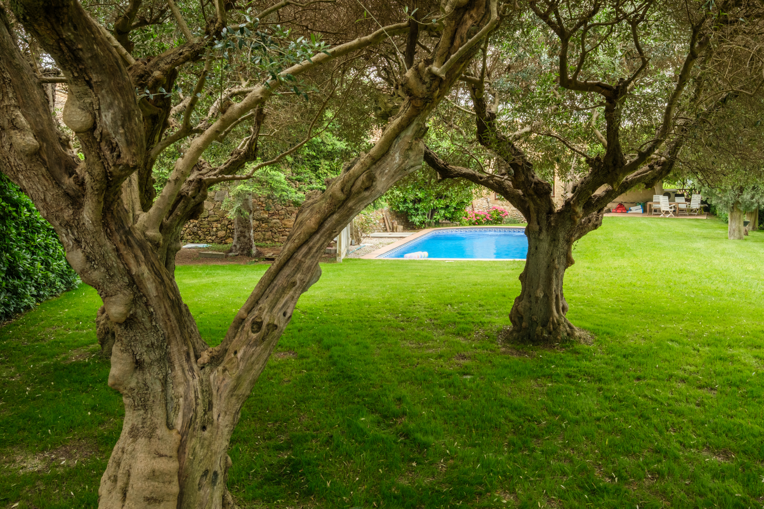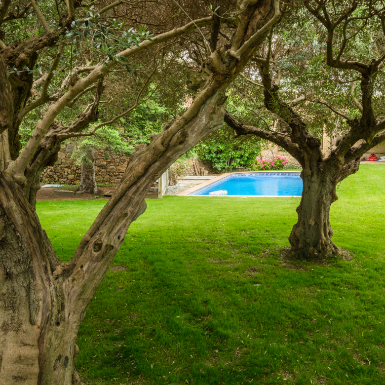 El jardí amb piscina i vegetació autóctona (oliveres) d’edat avançada.